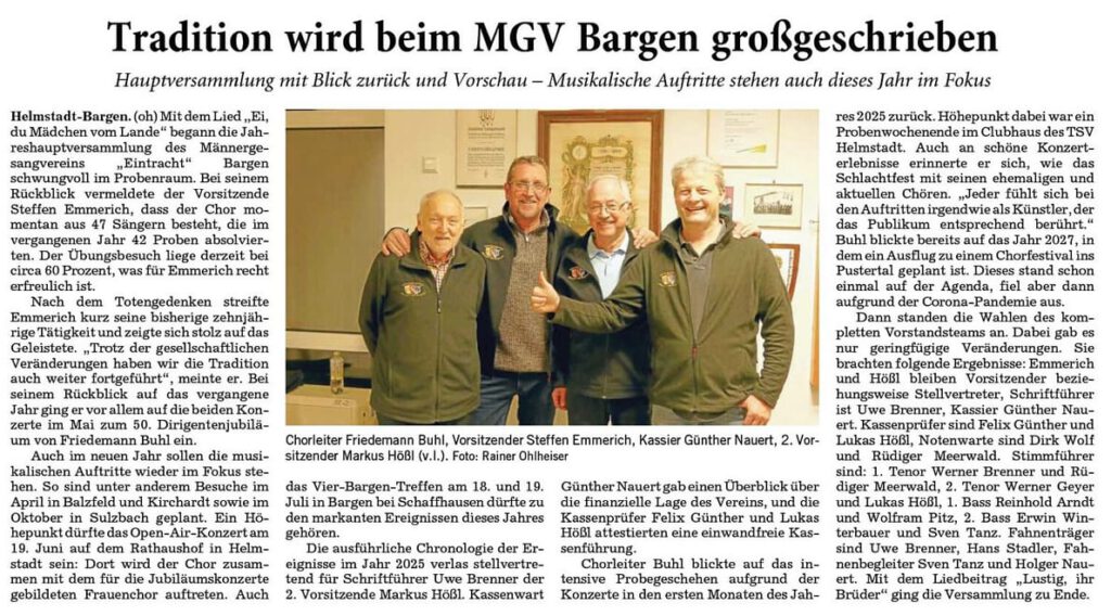 „Inspiration und Leidenschaft“ war das Motto für zwei Konzerte am vergangenen Freitag und Samstag in der Bargener Sporthalle des Männergesangvereins Eintracht Bargen. Diese Attribute legt der Dirigent des Chors Friedemann Buhl jetzt bereits seit 50 Jahren an den Tag, zu dessen Jubiläum diese Veranstaltungen durchgeführt wurden. Nach einer heißen Probephase war die jeweils vollbesetzte Halle der Lohn für alle Mitwirkenden. Ein besonderes Highlight war die Mitwirkung eines speziell für das Jubiläum ins Leben gerufenen MGV- Frauenchores. Basis dieses Chores bildeten die Festdamen, welche bereits 1981 zum 100-jährigen Vereinsjubiläum und zuletzt beim 40-jährigen Dirigentenjubiläum als Festdamenchor musikalisch aktiv waren. Zudem beteiligten sich eine große Anzahl Frauen bzw. Freundinnen der Sänger. Es war eine stramme Leistung für die Frauen, nach lediglich neun Probewochen diese Herausforderung zu stemmen. Der Männerchor begann zunächst mit traditionelle Stücken. Ohne Begleitung sang dieser das Lied „Morgenrot“, das bereits 99 Jahre alt ist. Es wurde komponiert von Robert Pracht. Nach einem gediegenen, ruhigen Beginn enthält es auch lautere Episoden. „Abendrot“ war die nächste Darbietung. Dieses Stück, komponiert von Franz Schubert im Jahr 1825, wird normalerweise als Sololied gesungen. Es wurde später von Jakob Christ für Männerchöre arrangiert. Jürgen Goloiuch begleitete langsam und feierlich am Klavier. Aus der Renaissance-Zeit stammt das Stück „Wie schön blüht uns der Maien“, gesungen nach einem modernen Arrangement von Friedemann Buhl, was zur Jahreszeit passte. Es ist eines der wenigen uralten Lieder, von dem die Noten noch erhalten sind. Es war ein Tanzstück aus höfischen Tänzen und wurde ohne Begleitung präsentiert. Ein Medley der Comedian Harmonists schloss sich an. Bei „Veronika, der Lenz ist da“, „Wochenend und Sonnenschein“, „Das ist die Liebe der Matrosen“, alles Original 20-er-Jahre-Musik begleitete Buhl am Klavier. Es wurde jetzt schon fetziger, aber es steckte viel Nostalgie bei den Liedern der praktisch ersten „Boy-Group“ in Deutschland drinnen. Dann war der Frauenchor an der Reihe. Die ersten beiden Lieder stammten aus dem damaligen Festdamenprogramm. Es waren das einfühlsame „Morning has broken“ von Cat Stevens und der bekannte Hit „I have a dream“ von ABBA. Friedemann Buhl begleitete am Klavier und Maria Kaltwasser übernahm das Dirigat. In dem Lied „Wie schön du bist“ von Sarah Connor geht es um die Geschichte von ihrem pubertierenden Sohn, der trotz seiner Narben im Gesicht für sie wie für jede Mutter das schönste Kind ist. Das spricht damit aus dem Herzen jeder Mutter. Der Satz stammte von Friedemann Buhl und am Cajon begleitete Nico Emmerich. Acapella präsentierten die Männer im Anschluss das melancholische Lied „Wie kann es sein“ nach dem Original-Satz der Wise Guys. „Die Liebe bleibt“ von Klaus Lage ist ein nicht so bekanntes Lied dieses Interpreten. Es handelt sich um die deutsche Fassung des Titels „As time goes bye“. Hier begleitete die Band, bestehend aus Harald und André Brenner sowie Nico Emmerich. Dies war dann auch beim Lied „Hoffnung“ von Peter Maffay der Fall, arrangiert von Annette Beichert und Friedemann Buhl. Es beschreibt die Hoffnung, dass es keinen Krieg mehr geben solle. Nach der Pause warteten Friedemann Buhl, Tatjana Sujakova, Annette Beichert und Jürgen Goloiuch mit einer gelungenen Überraschung auf. Sie spielten gemeinsam an einem Klavier die „Tritsch-Tratsch-Polka“ von Johann Strauß und erhielten dafür viel Applaus. Dann legte sich bei dem Lied „Benia Calastoria“ aus den Trentiner Bergen eine ergreifende Stimmung über die Halle. Es begann recht leise und endete mit einem lauten Schlussakkord. Auch das Publikum war hier mit einbezogen. Der Titel „Return to sender“ von Elvis Presley war von den Männern bei einem Ausflug nach Bargen/Bern in den Achtziger-Jahren bereits gesungen worden. „Crazy little thing called love“ von Queen wurde unter Begleitung von Klavier und Band im altmodischen Rock´n Roll-Rhythmus präsentiert. Für zwei Lieder wurden separate Gruppen zusammengestellt. Zwölf Sänger präsentierten „With a little help from my friends“ von den Beatles nach der Fassung von Ringo Star. Vier junge Sänger präsentierten mit viel Enthusiasmus nach dem Arrangement von Buhl mit Band-Begleitung „Junge“ von den „Ärzten“ und erhielten dafür einen tosenden Beifall. Alle Männer durften dann zum Lied „Küss mi“ von den Bläck Föös wieder ran. Dieses wurde aus dem „Kölschen“ in den hiesigen Dialekt übertragen. Dann traten wieder die Frauen auf die Bühne. „I will follow him“ aus dem Film „Sister Act“ wurde gekonnt geschmettert und kam sehr gut an. Die Ansage hierzu hatte der Vorsitzende Steffen Emmerich selbst übernommen, da er sich dieses Lied gewünscht hatte. Eine Überraschung für den Dirigenten durfte dann aber nicht fehlen. Erwin Winterbauer hatte das Lied „Griechischer Wein“ von Udo Jürgens entsprechend umgedichtet und das Publikum stimmte in den Refrain mithilfe der verteilten Liedblätter lautstark ein. Hier hieß es dann „Friedemann Buhl, Dirigent und Freund für immer, man ist der cool, schreibt Lieder, dirigiert schon immer, weil er es kann. Ja, er ist halt unser bester Mann, unser bester Mann!“ Sichtlich gerührt war Buhl von dieser Darbietung. Seine offizielle Ehrung wird erst im Oktober beim Ehrungsabend des Chorverbandes in der Dr. Sieber-Halle in Sinsheim vorgenommen. Trotzdem ließ es sich Michael Mireisz vom Chorverband Elsenzgau nicht nehmen, eine kleine Laudatio zu halten. Seitens des Vereins erhielt Buhl durch den Vorsitzenden Steffen Emmerich einen Gutschein für ein Wochenende im Drei-Sterne-Wohlfühlhotel „Frohsinn“ in Fischen im Allgäu sowie ein Buch mit alten Anekdoten rund um den MGV. „Thank you for the music“ von ABBA war der passende Schlusstite